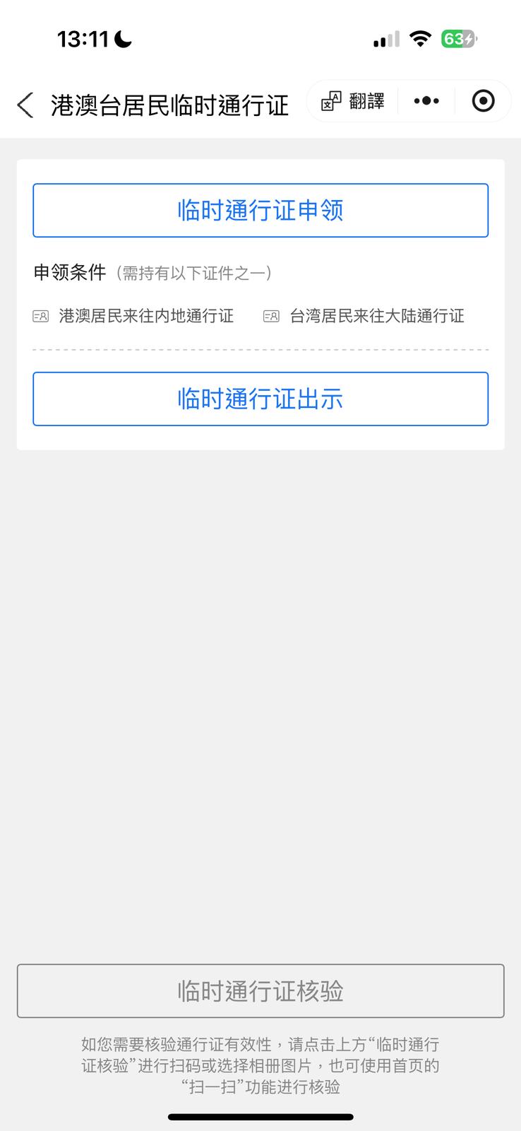 選擇“臨時通行證申領”,并輸入個人資料(需要使用內地電話號碼才能獲取驗證碼)
