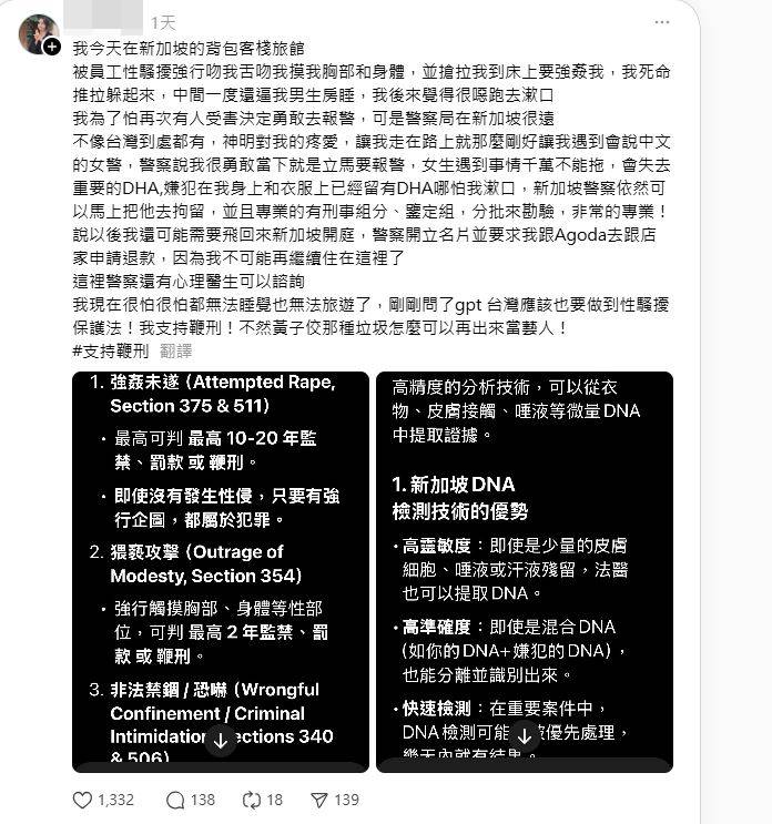女事主在新加坡的遭遇,引起臺灣媒體關注。 Threads