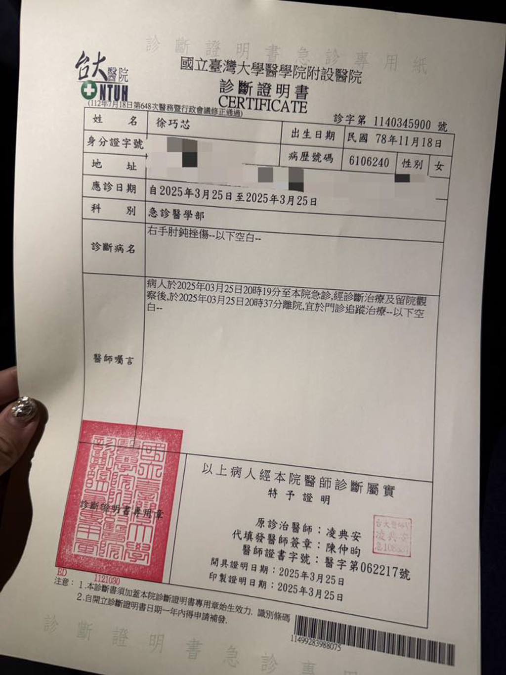 ▲圖為徐巧芯的驗傷單。(圖 / 取自徐巧芯臉書)