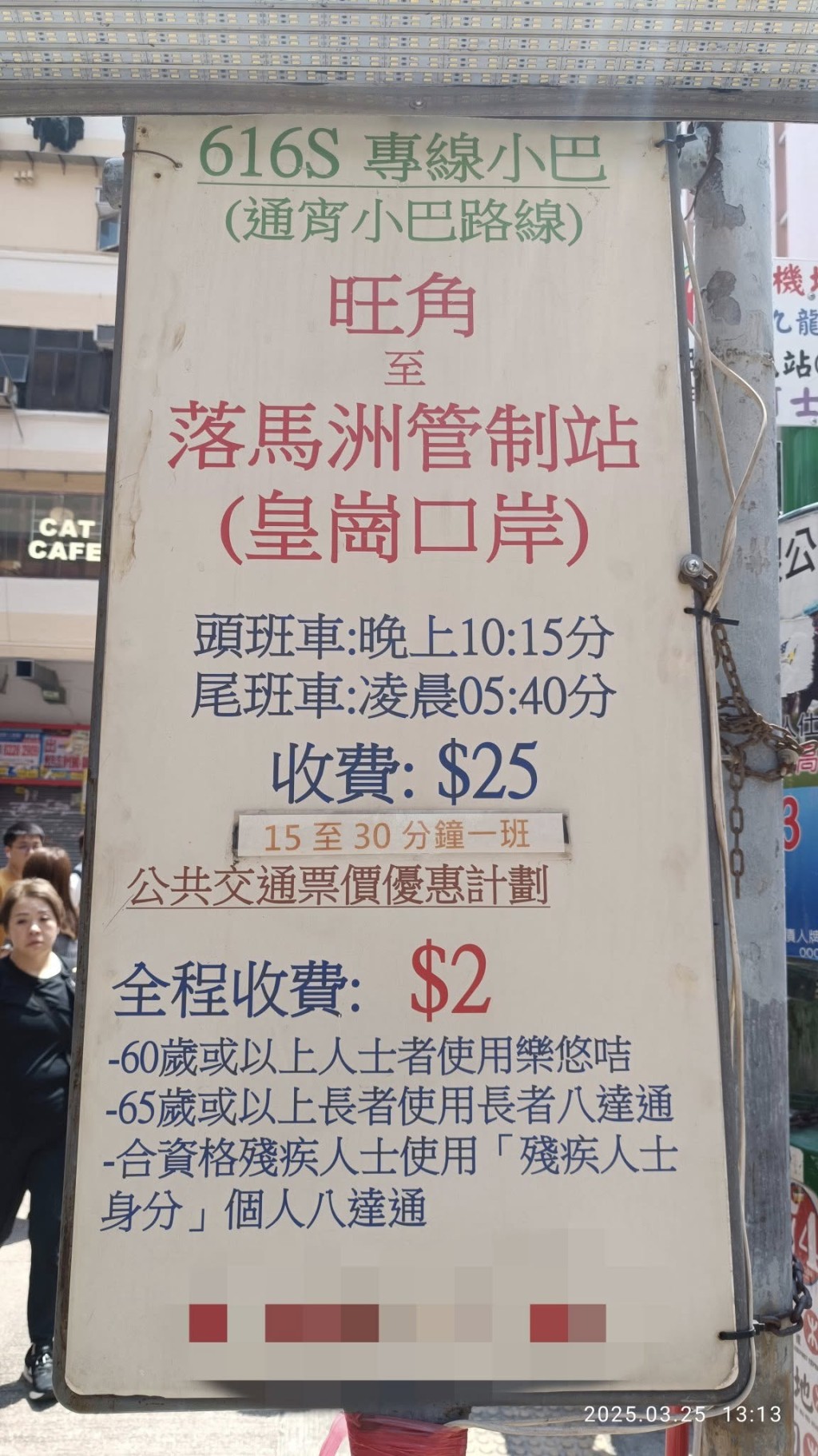 旺角通宵小巴616s 長者優惠$2直達落馬洲皇崗