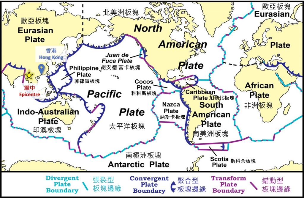 ▲全球構造板塊分布圖,黃色星標示了2025年3月28日緬甸7.6級地震的震中。天文臺網頁
