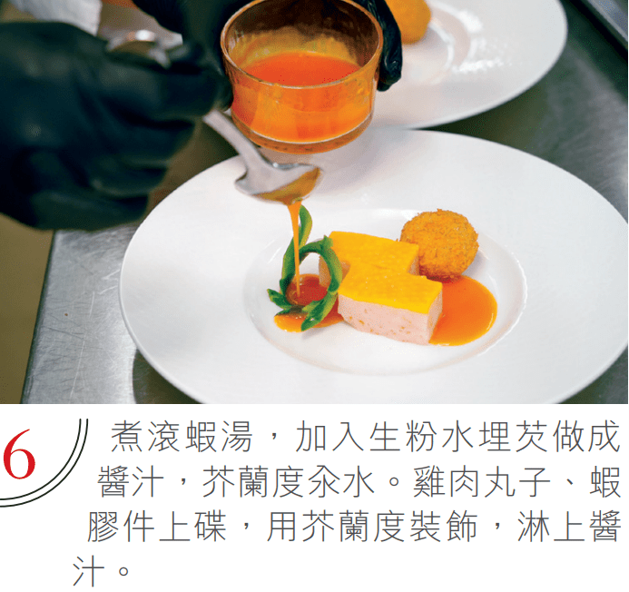 煮滾蝦湯,加生粉水埋芡做成醬汁,芥蘭度汆水。雞肉丸子、蝦膠件上碟,用芥蘭度裝飾,淋上醬汁。