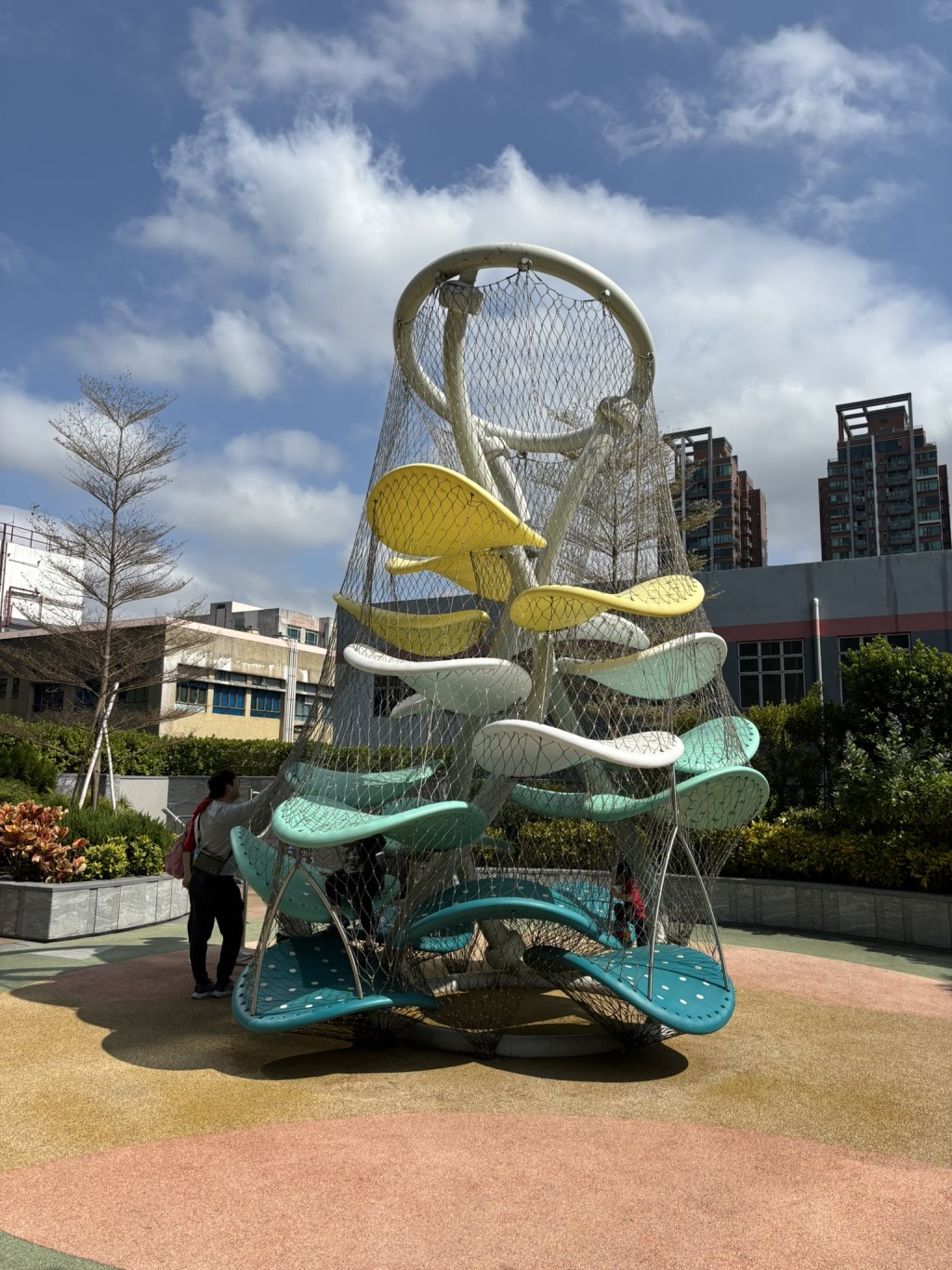 綠色設計的“千鳥塔”旋轉滑梯相當刺激,中間更有一段是不透光,感覺如在黑暗中滑行,由于高達兩層樓,建議五歲或以上兒童方可游玩,并需大人在旁看管。另外場內座椅來自香港藝術社企香港木庫以回收的塌樹木材設計出雀鳥造型的原木座椅,以藝術力量向其再注生命,制成游樂場的特色座椅,讓市民認識環境保護和資源再生等概念。