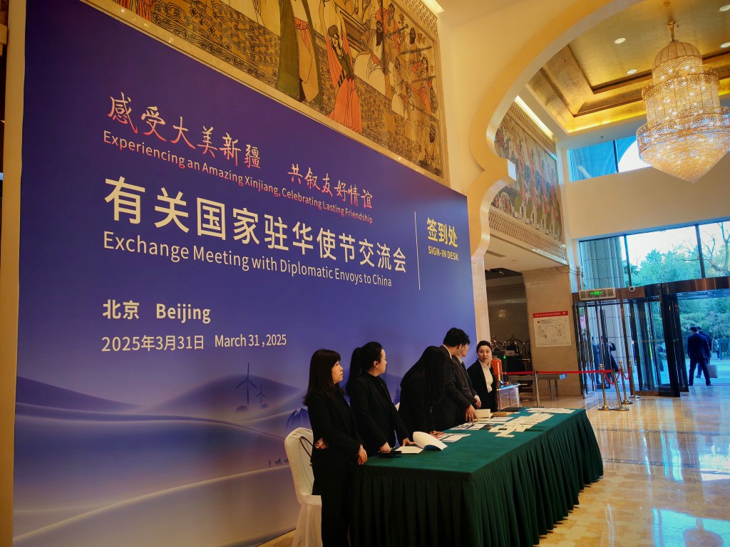 ▲北京的新疆大廈31日晚舉辦“有關國家駐華使節交流會”。