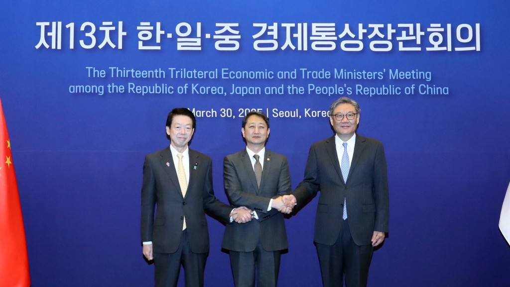 第13次中日韓經貿部長會議3月30日在韓國首爾舉行 。 美聯社