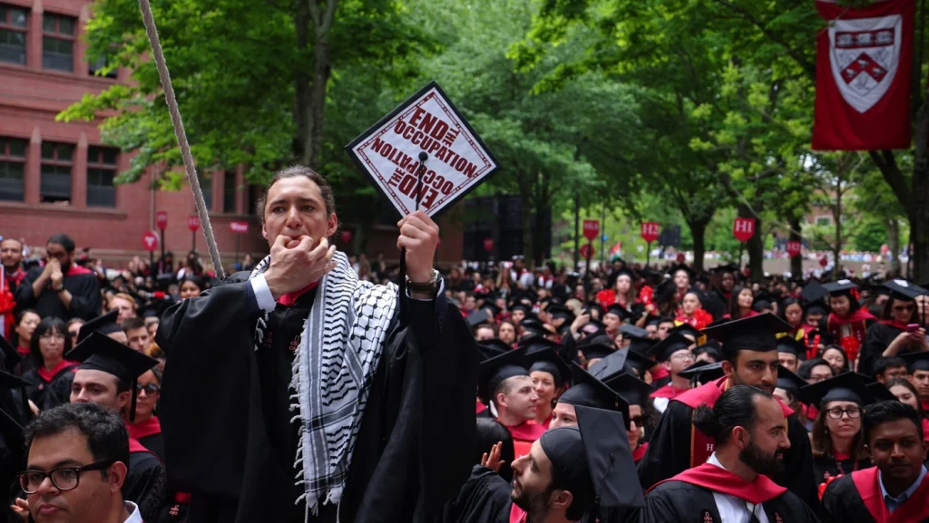 2024年5月有哈佛學生在畢業禮上支持巴勒斯坦。 路透社