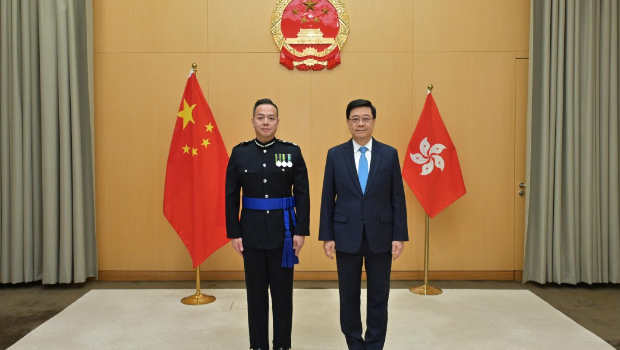 ▲行政長官李家超今日與新任警務處處長周一鳴(左)合照。政府新聞處圖片