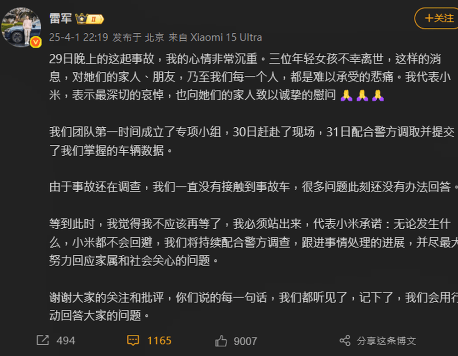 ▲小米創辦人雷軍發文挽救商譽。 微博@雷軍