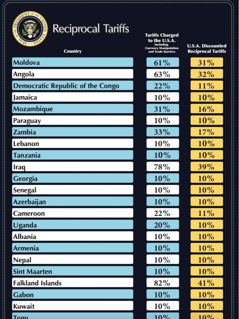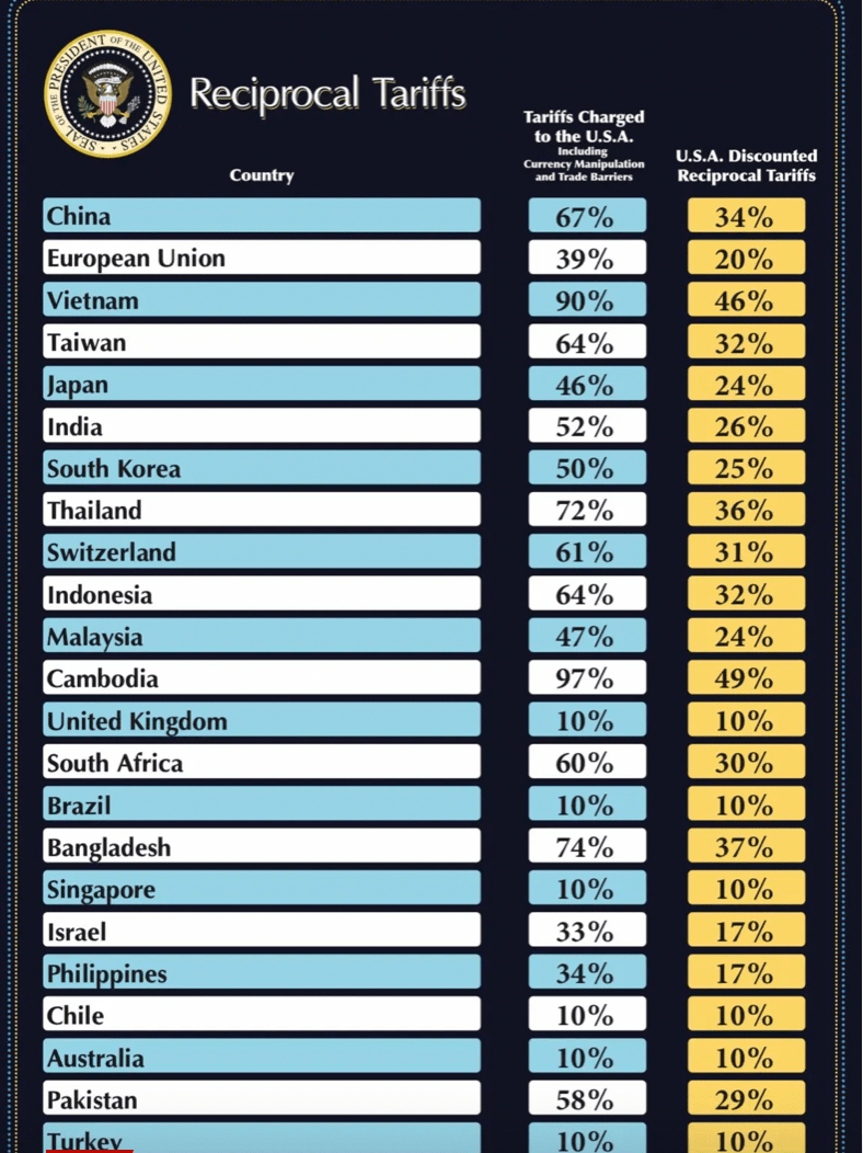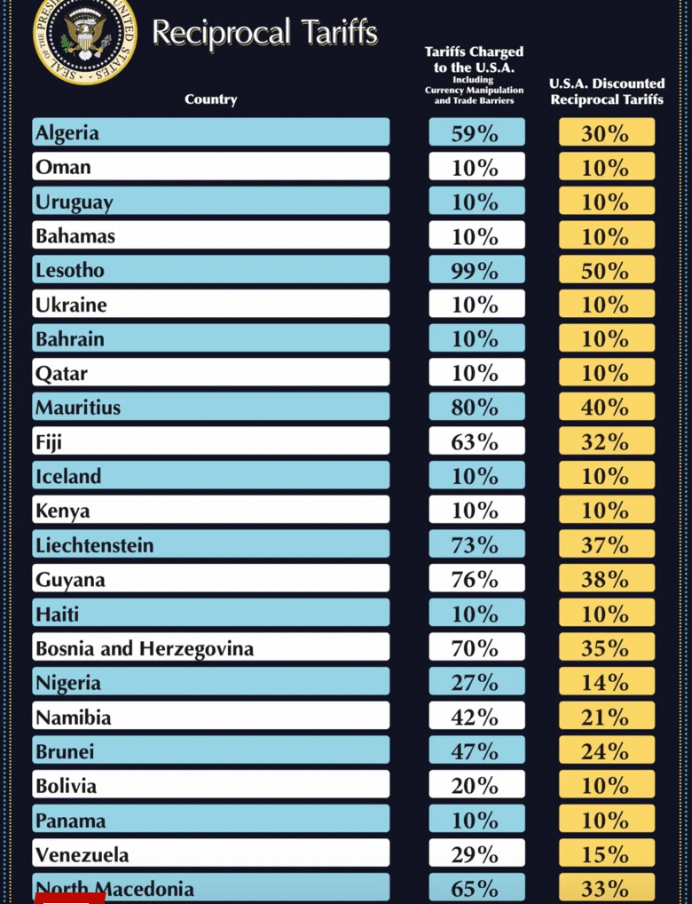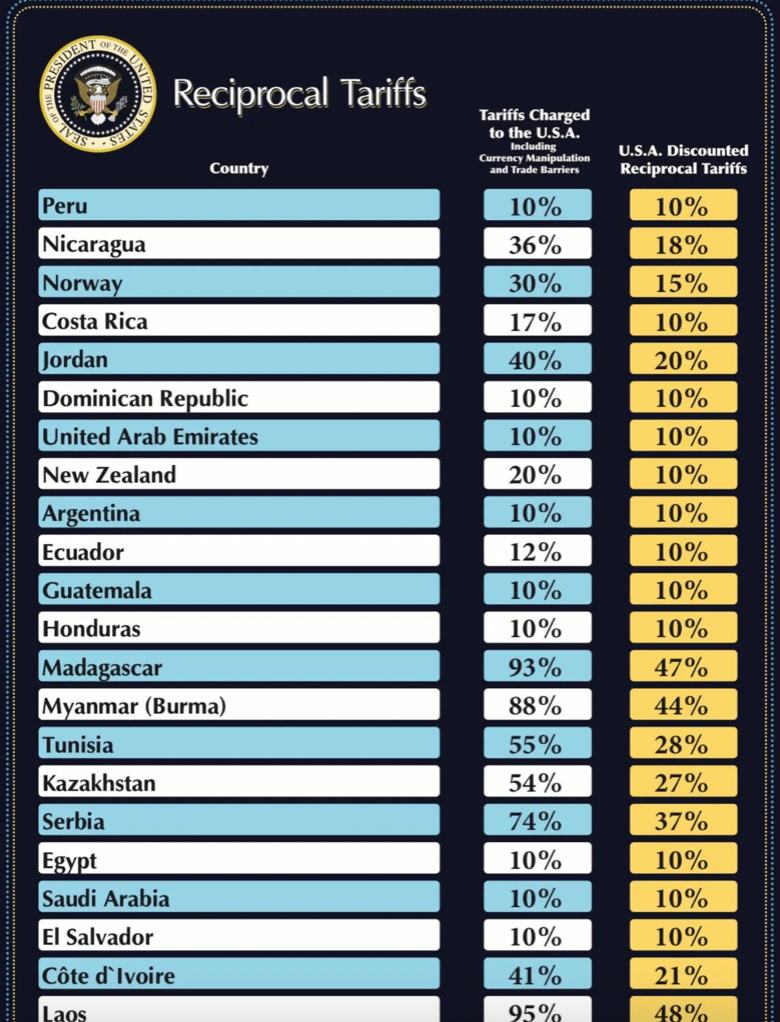 特朗普在公布對等措前幾小時,在社交平臺形容這是“美國經濟解放日”,至下午4點股市交易結束后,他在白宮玟瑰園公布詳情。 舉著一張題為互惠關稅的圖表,將其他國家對美國征收的關稅與美國征收的關稅進行比較。 他說,外國對美國征收的稅率許多都是美國征稅的一倍。