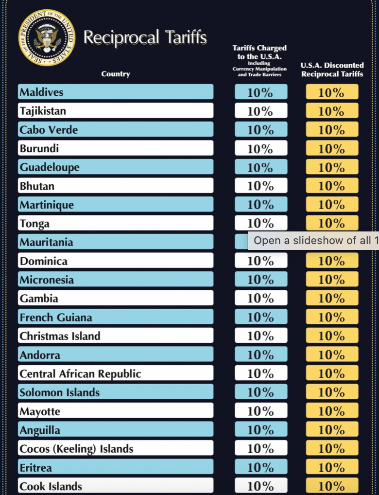 他隨后公布,對等關稅將向所有國家的進口貨品征收10%基準稅率,于4月9日生效,而數十個貿易逆差巨大的國家則加征更高的關稅,包括對中國征收34%稅率、歐盟20% 、日本24%的關稅,以色列17%等。
