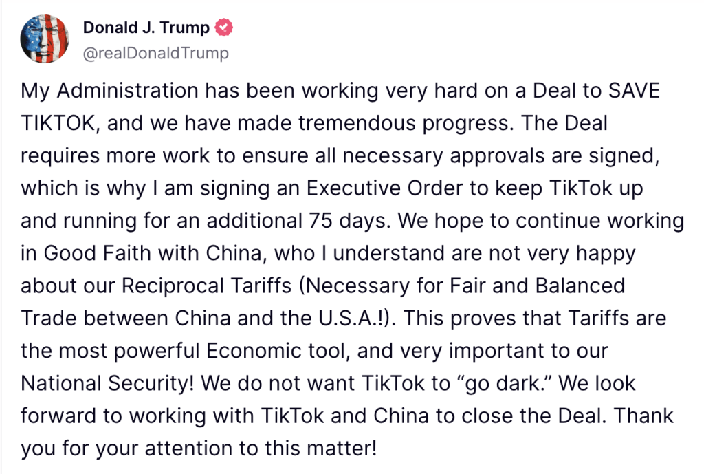 不過,在特朗普宣布征收對等關稅后,中國表示不會批準該交易,因此剝離TikTok美國資產的交易被擱置。特朗普于是在4日宣布延長TikTok禁令寬限期75天。