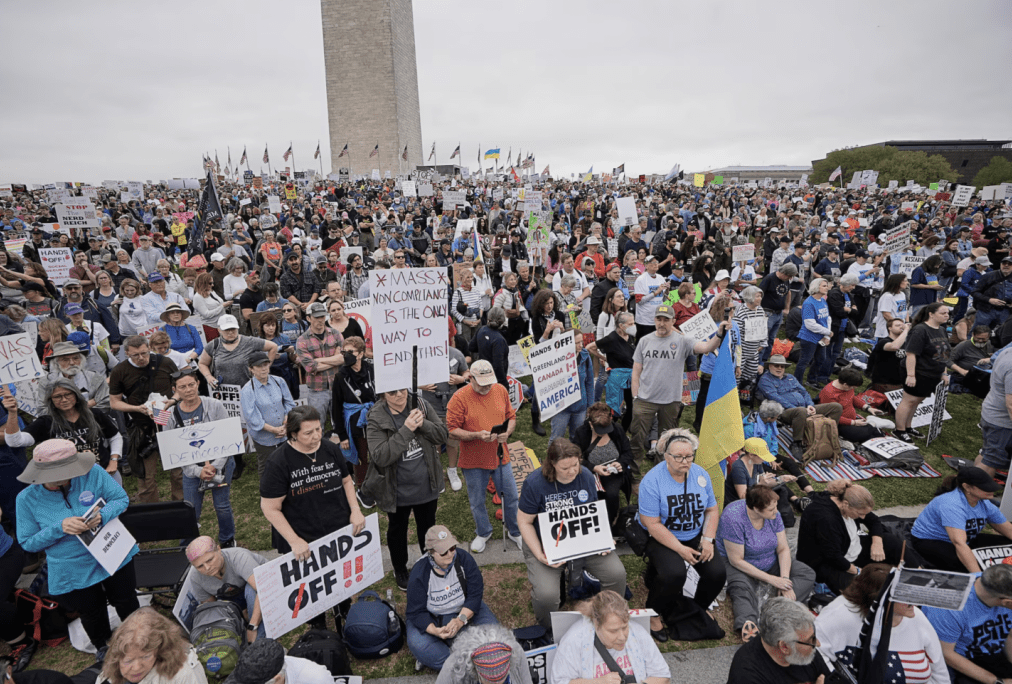 路透社引述活動主辦方指,僅在華府國家廣場的集會,就預計超過2萬人參加。人群在陰雨綿綿中聚集于華盛頓紀念碑前的大草坪,表達對政府裁員、移民打壓及最新關稅政策的強烈不滿。