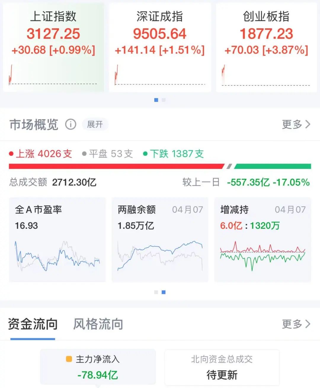 經歷了“黑色星期一”后,4月8日早盤,全球市場開始反彈了!今日收盤,上證指數(000001)漲1.58%,深證成指(399001)漲0.64%,創業板指(399006)漲1.83%。反關稅概念股持續發酵,農業股方向領漲;大消費集體反彈,零售、食品、白酒漲幅居前;電力、房地產、金融漲幅居前。財聯社報道,滬深兩市全天成交額1.63萬億,較上個交易日放量378億。