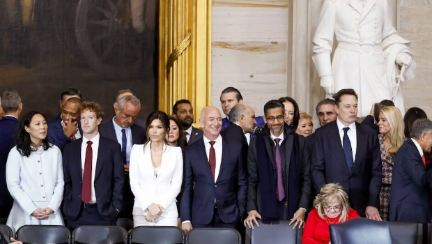 美國總統特朗普1月宣誓就職,臉書創辦人扎克伯格(前左2)、特斯拉執行長馬斯克(前排站立者右3)、亞馬遜創辦人貝索斯(前左4)、Google執行長皮查伊(前左5)等人出席典禮。