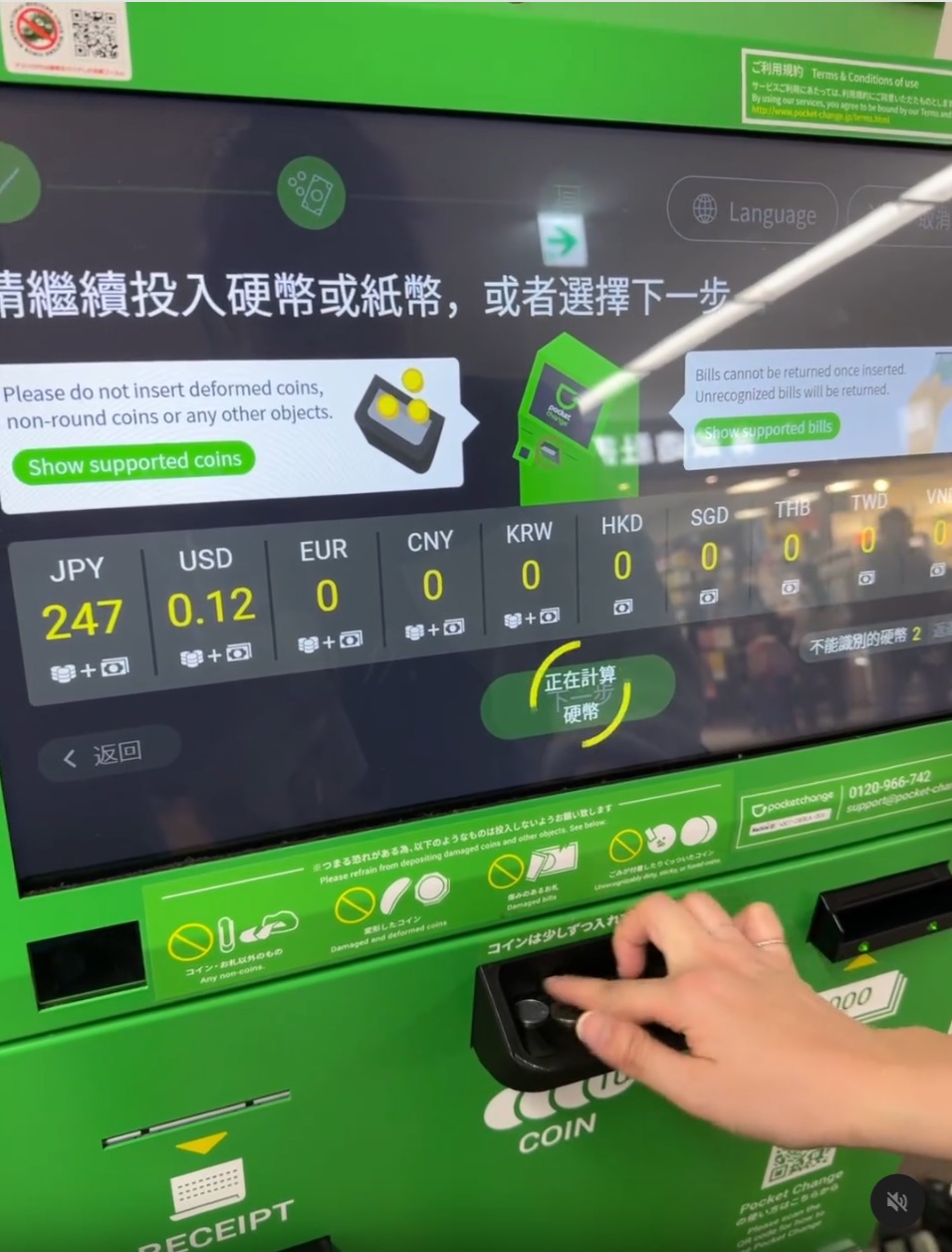 “Pocket Change”支持多款貨幣,其中人民幣、韓元、日元、美金及歐元適用于紙鈔及硬幣;而港幣、泰銖、臺幣、新加坡幣及越南盾則只適用于紙鈔。除了存入交通卡,亦可選擇將硬幣和紙鈔轉換成電子貨幣及電子禮券,如日本Amazon及Google Play Gift Card等。要留意,部份自助機不接受日元硬幣,前往時記得先在官網查詢!