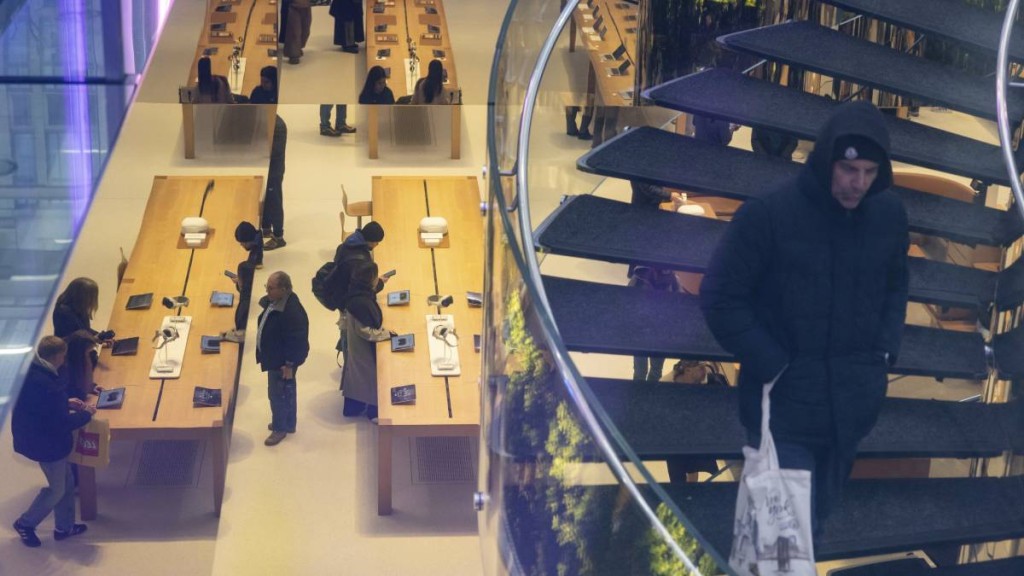 有美國民眾擔心關稅會導致蘋果iPhone加價,紛紛到門店購買。美聯社