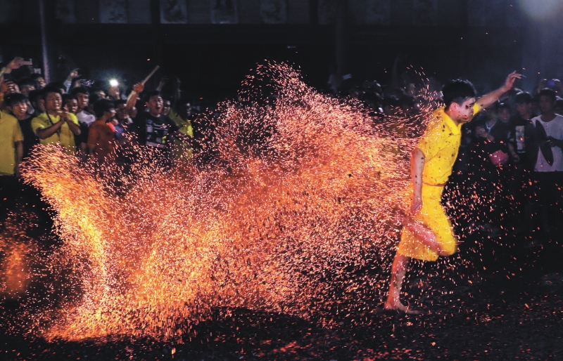 ▲水店村“下火?!眱x式上,勇者從火海中飛奔。