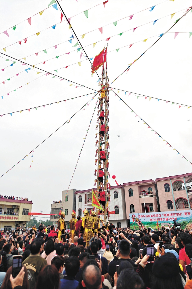 “爬刀梯”又稱“上刀山”,是湛江麻章區麒麟村每年農歷二月十一盛行的大型民俗祭祀儀式,2007年被列入廣東省第二批省級非物質文化遺產代表性名錄?!芭赖短荨逼鹪从谠摯遄鎻R敬奉的張興武大將軍筑人梯破城,為民除害的傳說。村民們赤足徒手在18米高的刀梯上上下自如,以示膽藝高超。