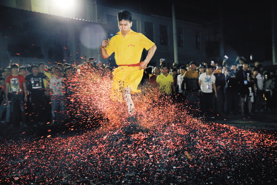 當地還有“上刀梯”與“過火?!眱纱竺袼捉^技。36把鋼刀豎立成梯,赤腳攀登者如履平地,既是祭祀祈福,亦彰顯無畏;后者則是元宵節祈福習俗,村民赤腳踩踏烈焰,祈求平安。從“火?!敝刑み^的村民說:“連‘火?!几姨み^,往后遇到什么困難都不怕,就好像‘過火?!粯哟蟛經_過去就行!”