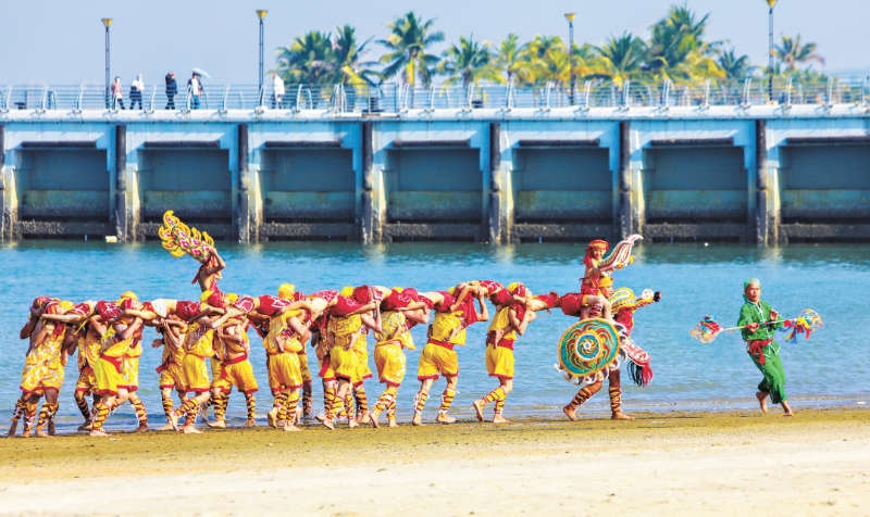 起源于明末清初的“人龍舞”,作為國家級非物質文化遺產代表性項目,享有“東方一絕”的盛譽,常在海邊、沙灘上演,承載著雷州人對風調雨順、出海平安、豐收的祈愿。王宏偉,這位湛江人龍舞藝術團團長、東海人龍舞第六代傳承人,帶著自己的兩個兒子一同參演,父子三人攜手,讓這傳承百年的技藝薪火相傳。湛江人龍舞藝術團每年都會精心組織4至6次“非遺進校園”活動。王宏偉滿懷期待地說:“我盼望著不久的將來,人龍舞能像英歌舞一樣大放異彩,廣受歡迎?!?/p>