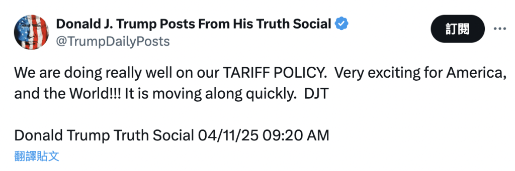 ▲特朗普周五則在社交平臺發文,稱關稅政策做得非常好。