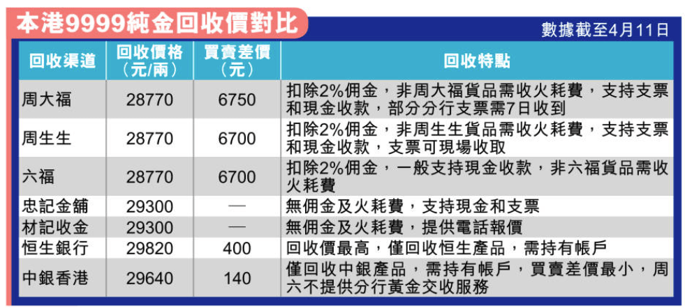 銀行雖然黃金回收價最高,但并非來者不拒,只收獲香港黃金交易所認證五両或以上的足金金條及自家產品,老字號金鋪與連鎖珠寶金行均來者不拒,惟后者除了須額外扣除2%傭金,而非自家貨品還需額外扣除火耗,故賣金都要格價,隨時多一萬幾千元落袋。