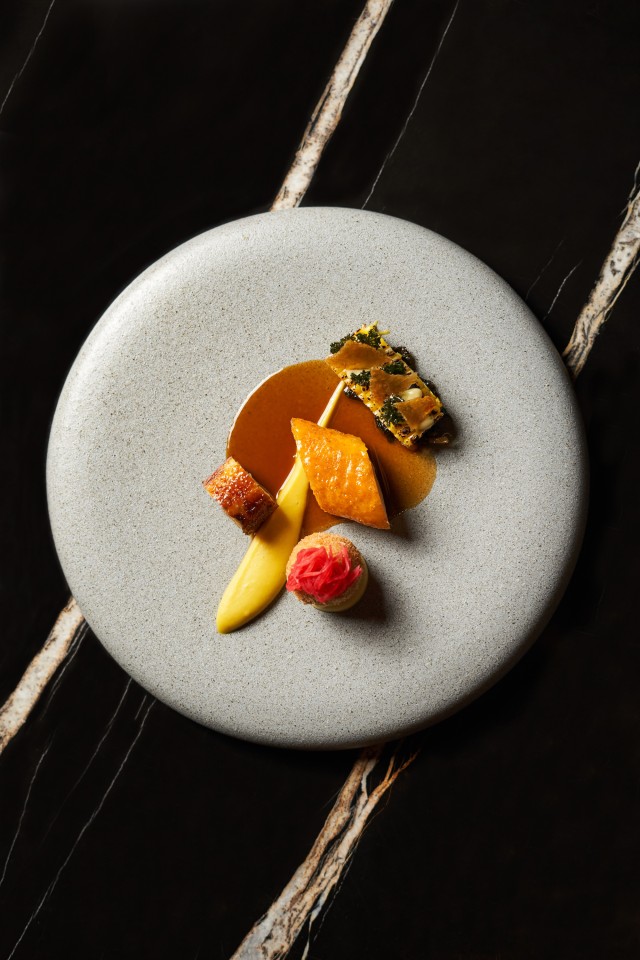 Chef Sebastian認為香港三黃雞是優質及普及的食材,他因應三黃雞各部分的特點入饌,先煮成醬汁和高湯,再把慢煮雞胸肉烤焗,制好的雞肉慕絲造成法式香腸的形狀,接著將慢煮雞髀肉與白汁和香草制成炸丸子,最后配以烤雞皮奉客,烹法講究令這道結合中西風味的菜式充滿驚喜。