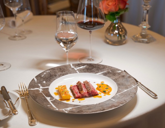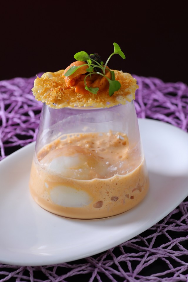 頭盤的選擇有凍意式云吞配煙熏螯蝦、日本A4和牛伴龍蝦油法式面包多士,以及日本紅帝王蟹蛋泡沫等,屬清甜鮮美的開胃西餐。 主菜選材豐富,例如西班牙紅蝦配北非小米,佐以乾魷魚及夏威夷果仁醬,并有慢煮羊肉配卡蒙貝芝士番薯醬、美國頂級牛柳配香煎山楂鵝肝等,菜式利用配搭得宜的食材及自制醬汁,展現地道歐陸菜濃郁鮮香的飲食精髓。