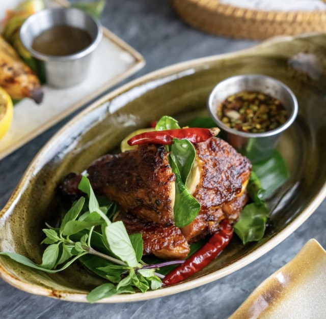 主菜部分同樣讓人滿意,香烤泰式三黃雞配雞油米形意粉:三黃雞經過慢烤處理,外皮香酥、肉質鮮嫩,搭配的米形意粉,每口也吸附著濃郁雞油芳香。 香烤封門柳配椰菜仔及參巴甜椒醬,封門柳搭配參巴甜椒醬的微辣作味引,帶出濃厚肉香。 香煎原條馬友配舞茸及糯米酒汁,馬友魚煎得魚皮干身香脆,魚肉則保持油香嫩滑,再點綴以糯米酒汁,提升整體風味。