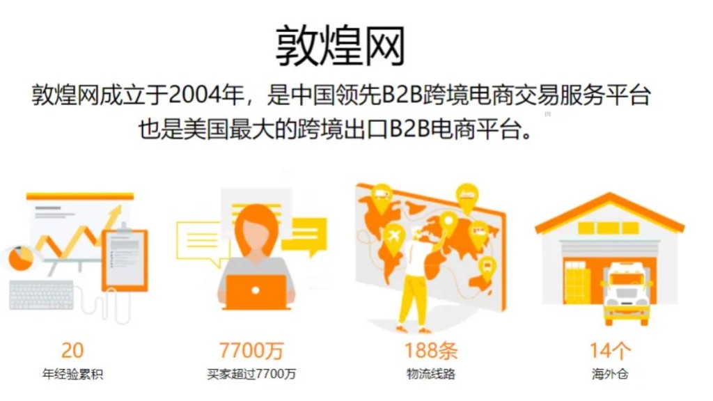 敦煌網創立于2004年,是中國內地首個為中小企業提供B2B跨境在線交易服務的網站,現已成為美國市場最大的中國跨境B2B電商平臺,打通中國中小制造企業與北美中小批發商鏈路。