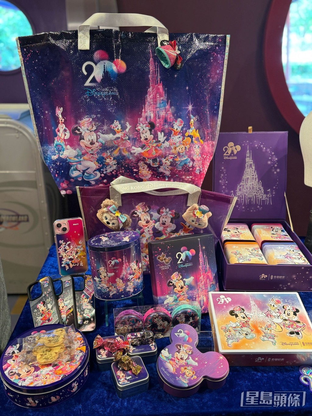 迪士尼樂園推出超過300款獨家20周年主題商品,如穿上全新20周年服飾的米奇與好友及Duffy與好友公仔、徽章、手機殼、大富翁游戲、拼圖、菲林相機等等;同步推出超過80款20周年主題美食及飲品,包括冬甩、杯子蛋糕、爆谷筒、牛角包等,賣相精致。