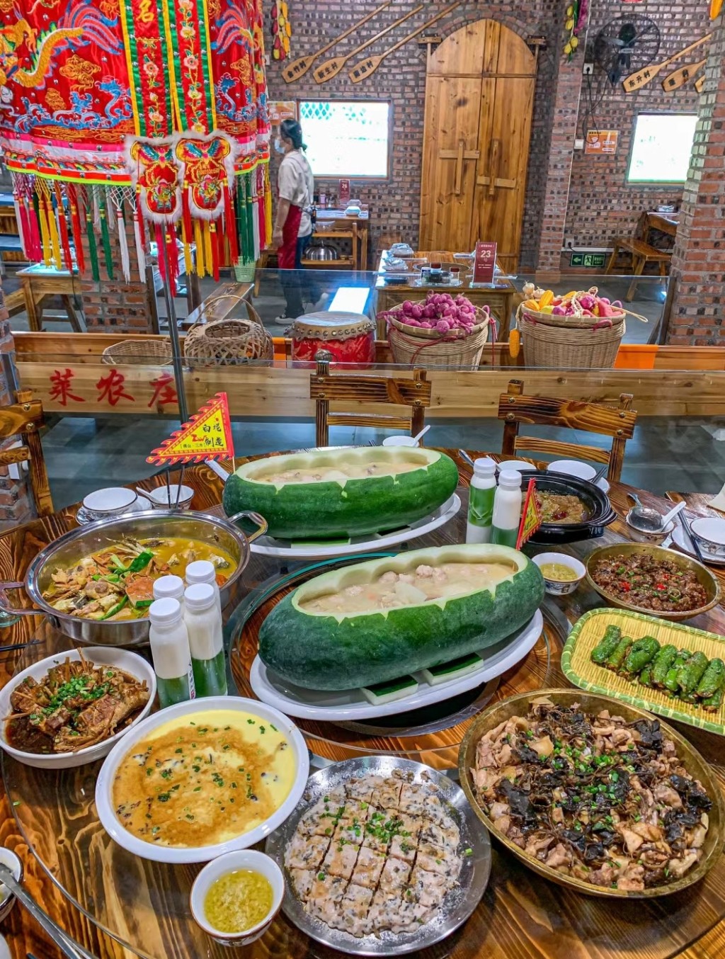 佛山康喜萊農莊位于佛山文創古鎮白坭的西江河鮮美食街內,是佛山首間龍舟主題餐廳,前庭餐廳提供龍舟文化展覽、餐飲美食,最夸張是那張13.8米長的龍船桌,是目前佛山市內唯一一張以五人龍舟文化為載體的巨型餐桌,可以容納50人用餐。后庭有二十多種農作物、十多種時令水果,提供新鮮食材,也是農場觀光、親子活動的好去處。農莊有四大招牌打卡美食,必吃冬瓜艇,用一個長冬瓜刮空作為容器,放上冬瓜肉、蝦、貝類、豬肚、肉丸等,湯味鮮甜。其他三種是金錢蓮燉湯、秘汁蟹壬雞、龍船飯,人氣美食有佛山原創雞煲蟹、禾稈蓋珍珠,和以“三水黑皮冬瓜”首創翡翠撞奶、翡翠糕、翡翠冰粉等特色小吃。