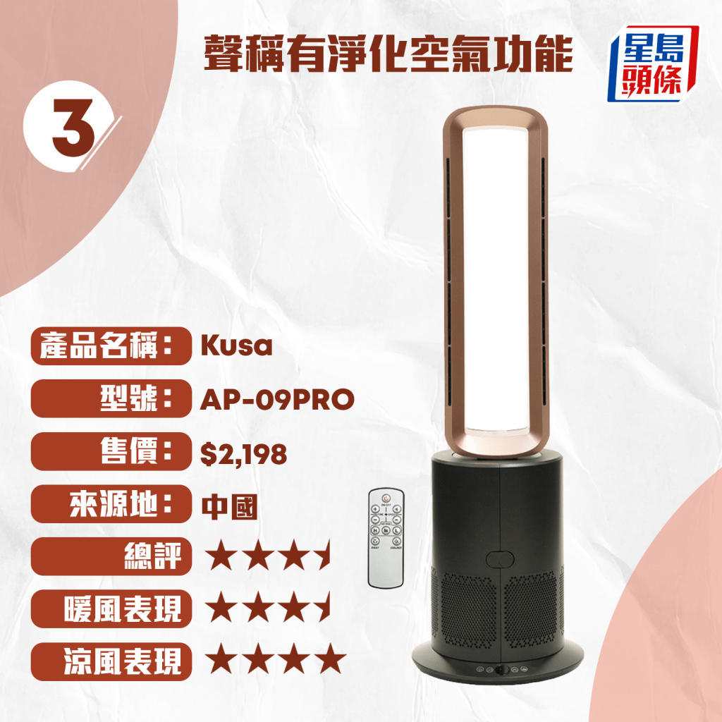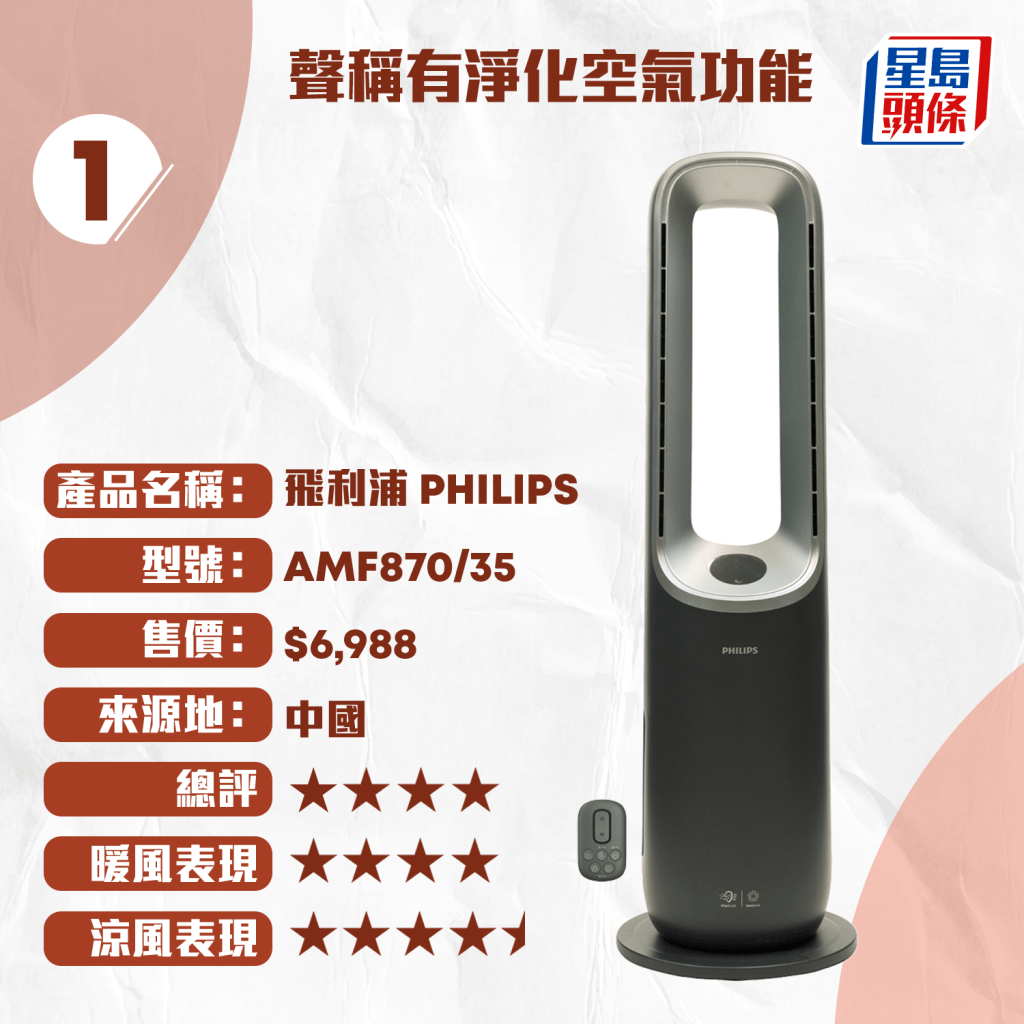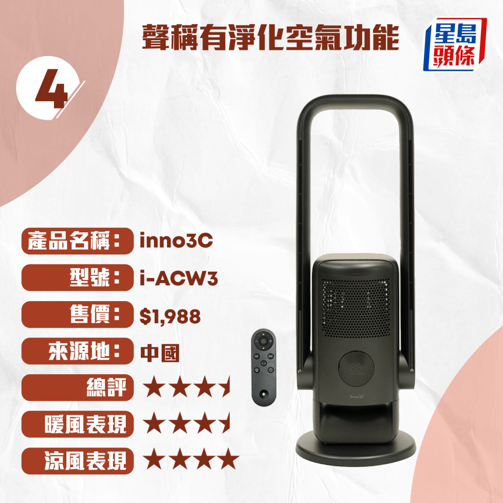 測試中,4款風扇獲得4星評分,包括售價最高的“飛利浦 PHILIPS”冷暖無葉風扇($6,988)、“dyson”($4,480)、“德國寶 German Pool”($1,980)及“Power Living”($1,598)。其中,“飛利浦 PHILIPS”與“dyson”配備HEPA過濾器,且送風量及加熱速度表現優秀。而最平價的“家の逸 Yohome”冷暖無葉風扇($699)則獲3星半評分,性價比媲美售價$4,990的“LG”風扇。
