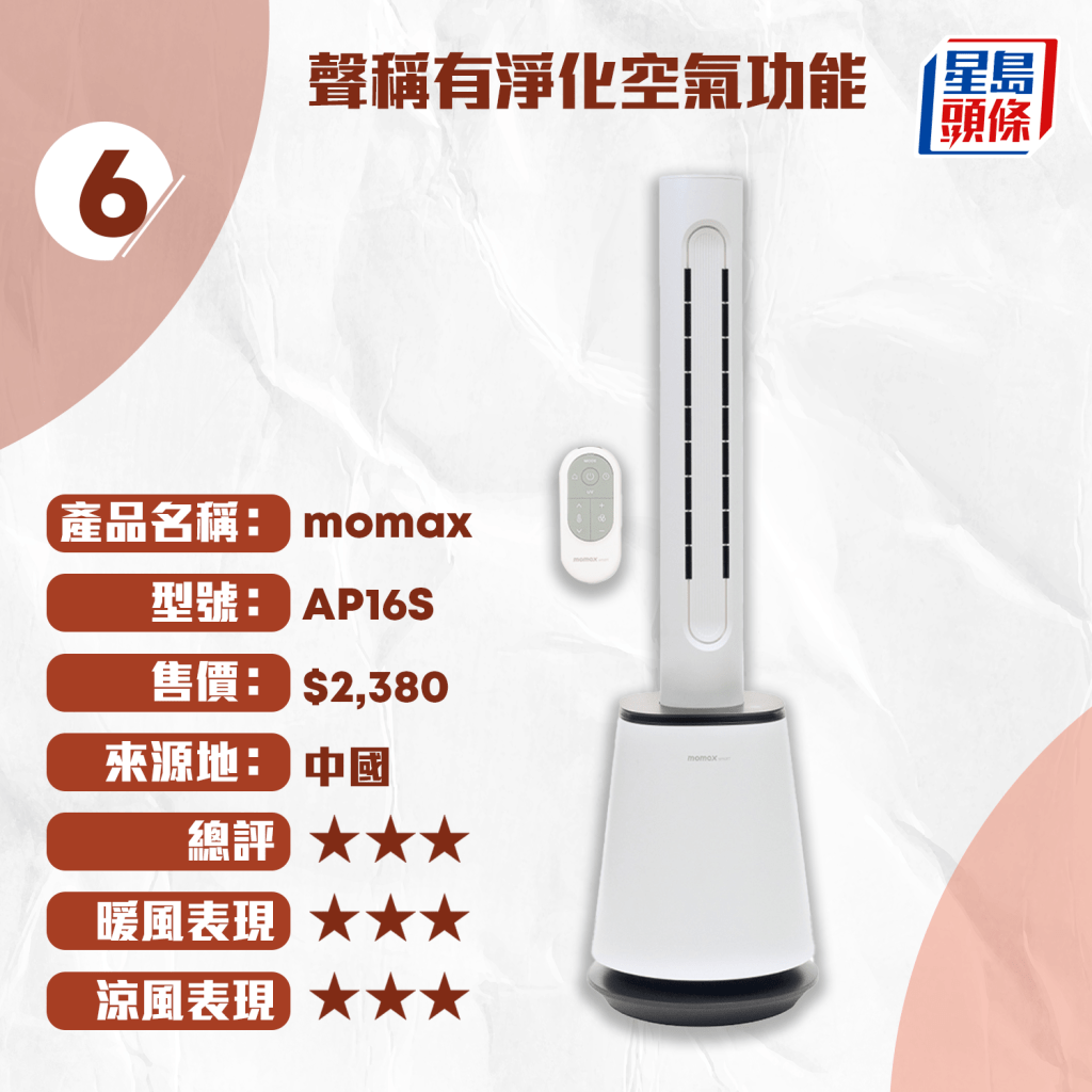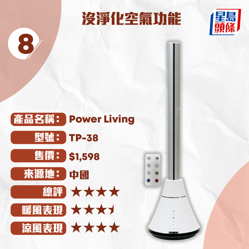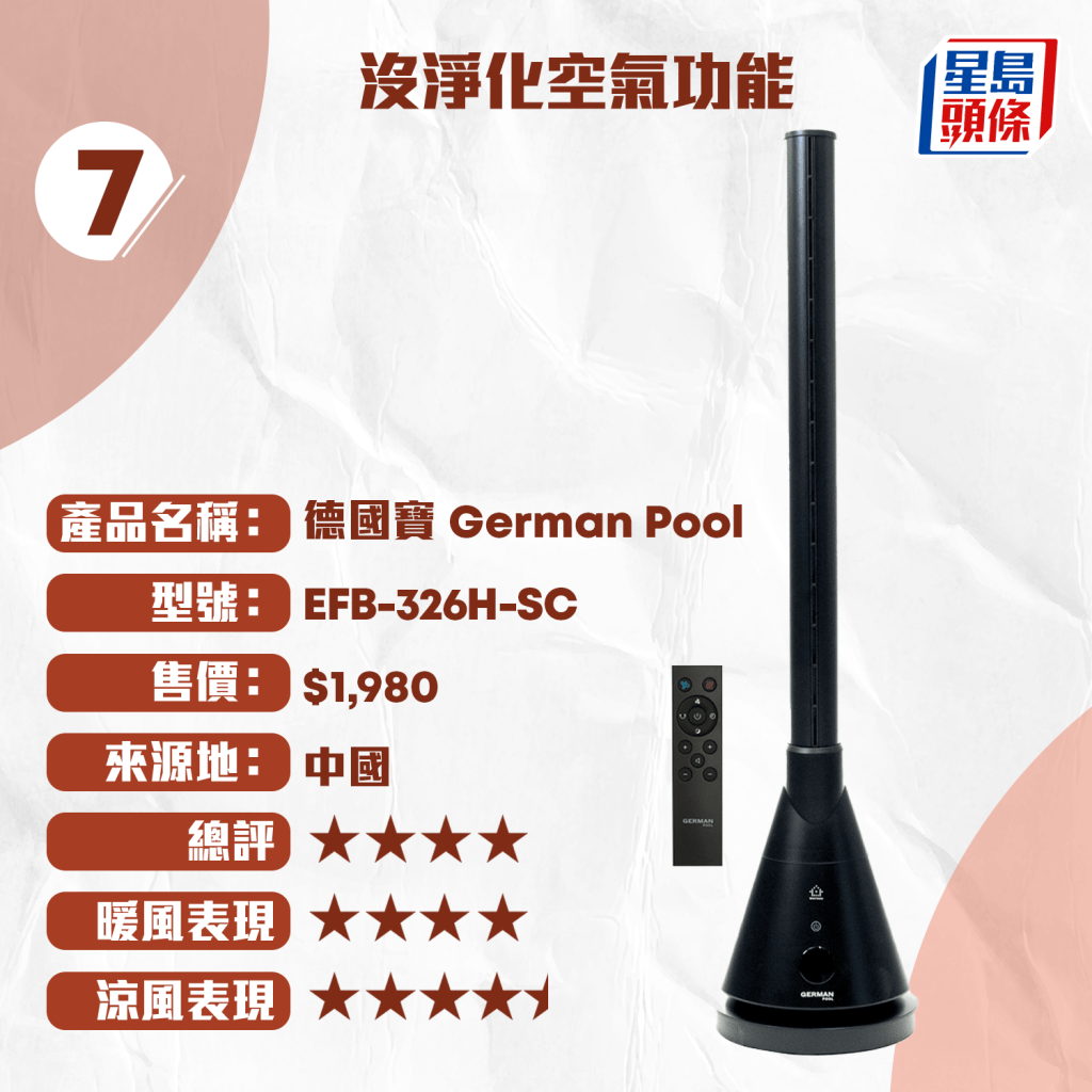 測試中,4款風扇獲得4星評分,包括售價最高的“飛利浦 PHILIPS”冷暖無葉風扇($6,988)、“dyson”($4,480)、“德國寶 German Pool”($1,980)及“Power Living”($1,598)。其中,“飛利浦 PHILIPS”與“dyson”配備HEPA過濾器,且送風量及加熱速度表現優秀。而最平價的“家の逸 Yohome”冷暖無葉風扇($699)則獲3星半評分,性價比媲美售價$4,990的“LG”風扇。