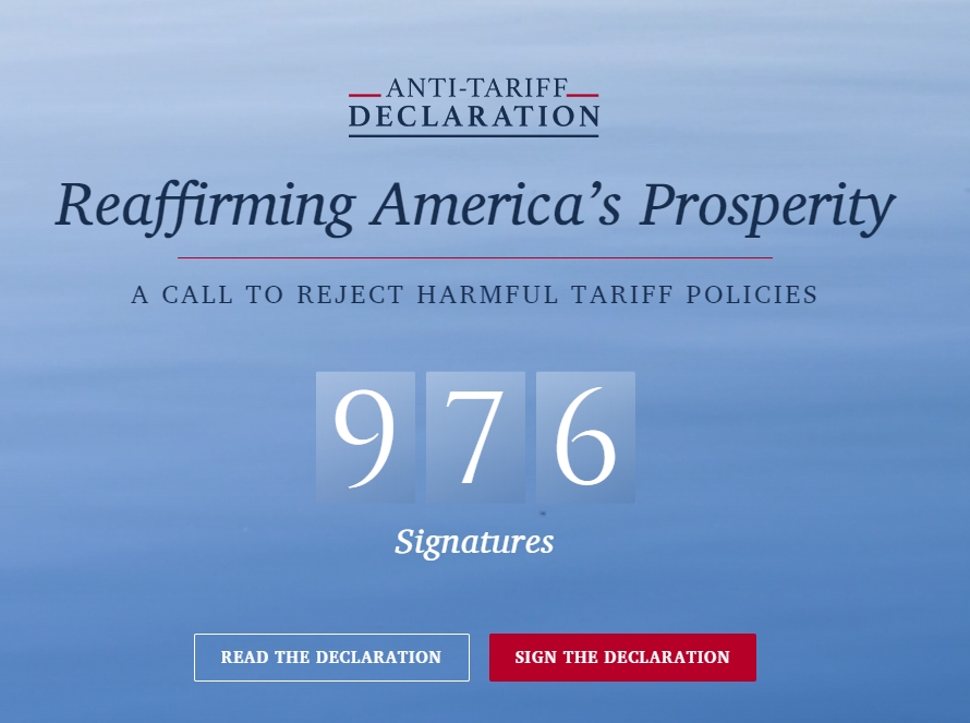 截至當地時間4月20日凌晨0時8分,“反關稅”網站顯示,已有976人簽署這份“反關稅宣言” ,其中包括數十名經濟學者。
