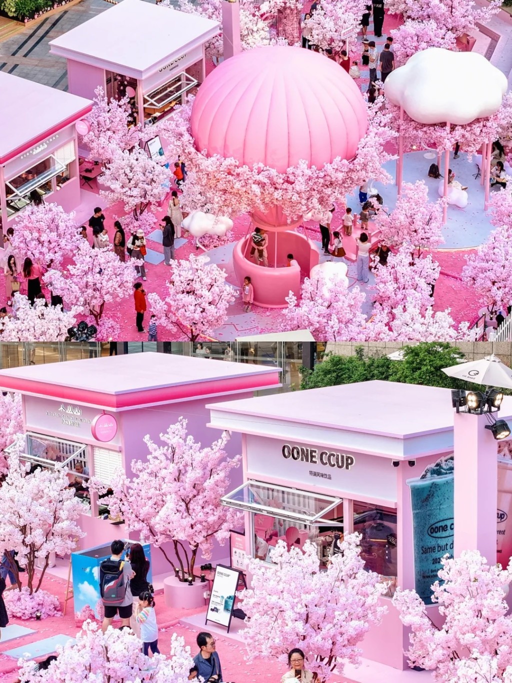 “云櫻之境”是深圳布吉萬象匯商場推出的一項特別企劃,旨在打造一處以櫻花為主題的浪漫場景。據商場介紹,展覽包括櫻花大道、巨型粉紅熱氣球、櫻花鏡面電話亭等多個亮點設計,并搭配櫻花主題美食及快閃店,如抹茶冰淇淋和櫻花形狀面包等,為游客提供一站式拍照、品味和體驗的場所。