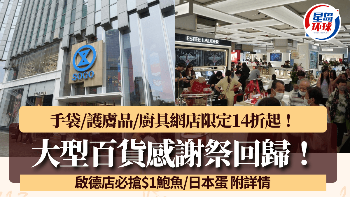 崇光感謝祭將于4月25日至5月25日分兩階段推出,而SOGO網店率先進行預售,名牌手袋、配飾、廚具、行李箱低至14折發售。SOGO崇光更同步推出3大優惠攻略,全新開幕的啟德店更每日推出$1精選貨品及低至1折優惠,即睇抵買推介!