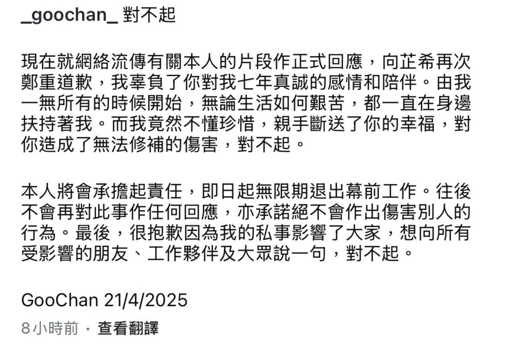 Goo Chan昨晚在IG發文致歉。