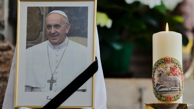 ▲天主教宗方濟各辭世,德國一處天主教堂外有信徒豎立方濟各遺照點燭致哀。(美聯社)