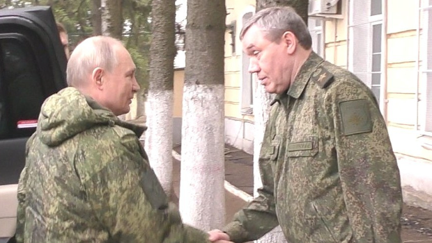俄羅斯總統普京(左)和俄羅斯武裝力量總參謀長格拉西莫夫在庫爾斯克地區一個指揮中心握手。