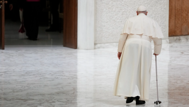 ▲教宗方濟各在梵蒂岡保祿六世大廳會見圣母大殿“耶穌誕生實境劇”的表演者后離場。(圖/美聯社)
