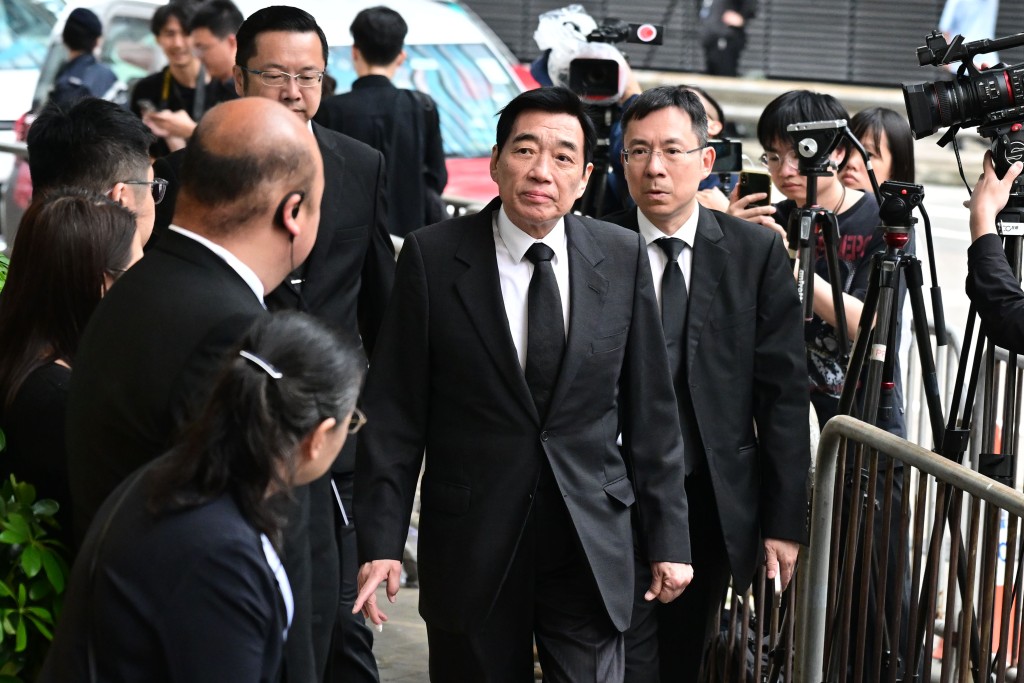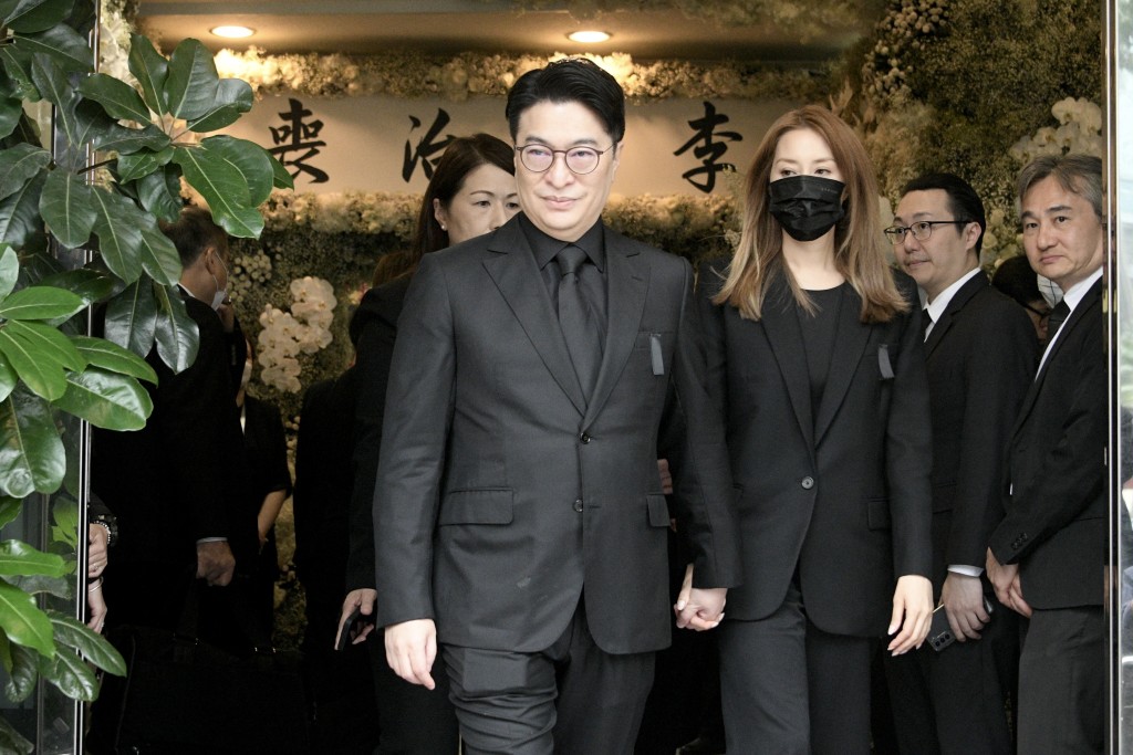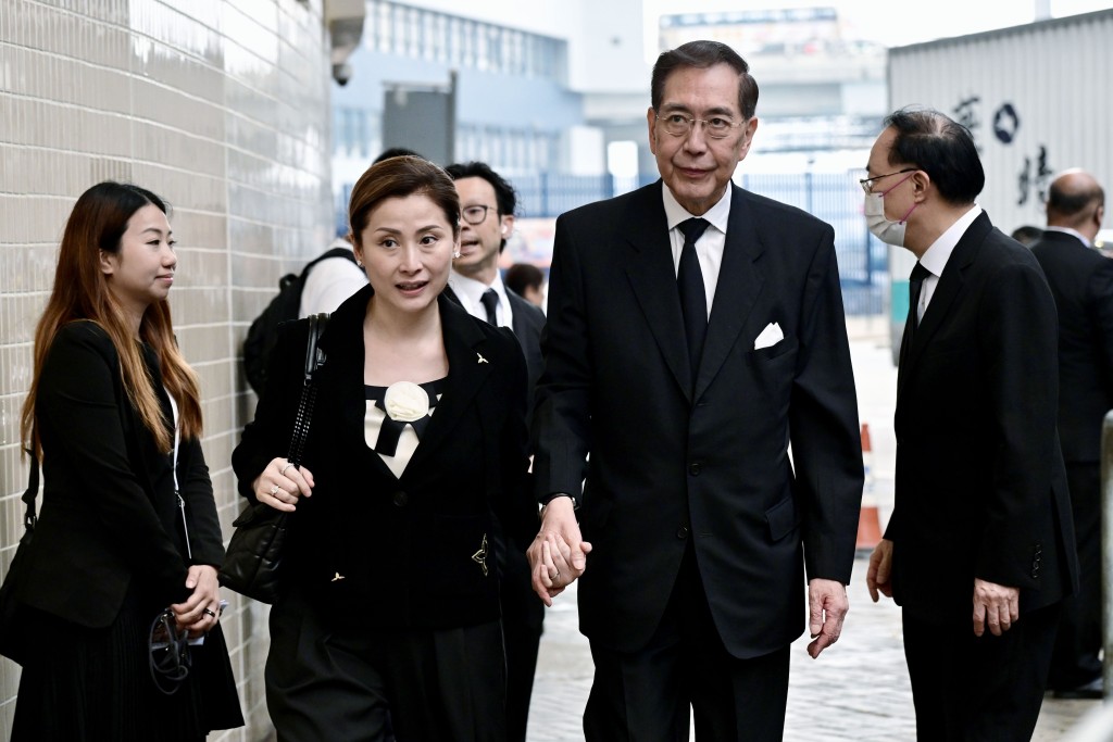 李兆基家人在香港殯儀館外見傳媒。 劉駿軒攝