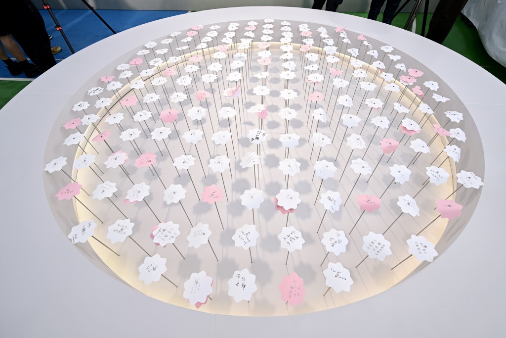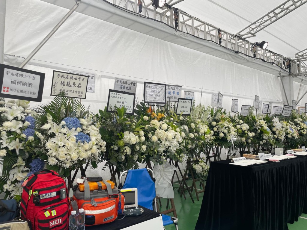 李兆基設靈,大型帳篷悼念區內有花池,載有不同人士留下的致意。