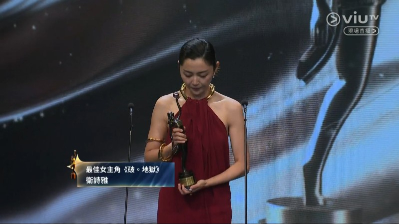22:24 由吳彥祖及曾國祥頒發最佳女主角,由衛詩雅《破·地獄》奪得,衛詩雅在臺上與臺下哭成淚人的“哥哥”朱栢康說:“阿哥我哋得咗!”另外她又多謝老公周祉安。