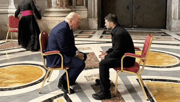 ▲在這張由烏克蘭總統新聞辦公室提供的照片中,烏克蘭總統澤連斯基和美國總統特朗普于 2025 年 4 月 26 日星期六在梵蒂岡參加教宗方濟各的葬禮時交談。美聯社