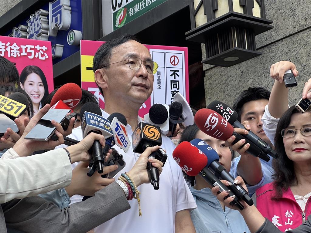 國民黨主席朱立倫今上午前往臺北市永春市場替藍委徐巧芯站臺街講,會后受訪。中時