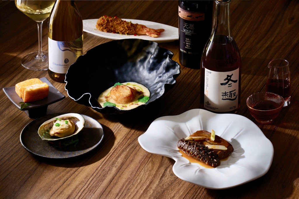 菜單包括清酒啫喱鮑魚、蟹肉窩貼多士、姜蔥汁元貝皇、濃湯雞絲羹、避風塘虎蝦柳及柱侯牛面頰燴關東遼參等,分別伴上白中白氣泡酒、浙江紹興冬趣黃酒、山東白葡萄酒及新疆馬瑟蘭紅酒等。其中姜蔥汁元貝皇配一杯浙江紹興冬趣黃酒,酒質醇厚散發果干香氣,層次多變令元貝更甜美。