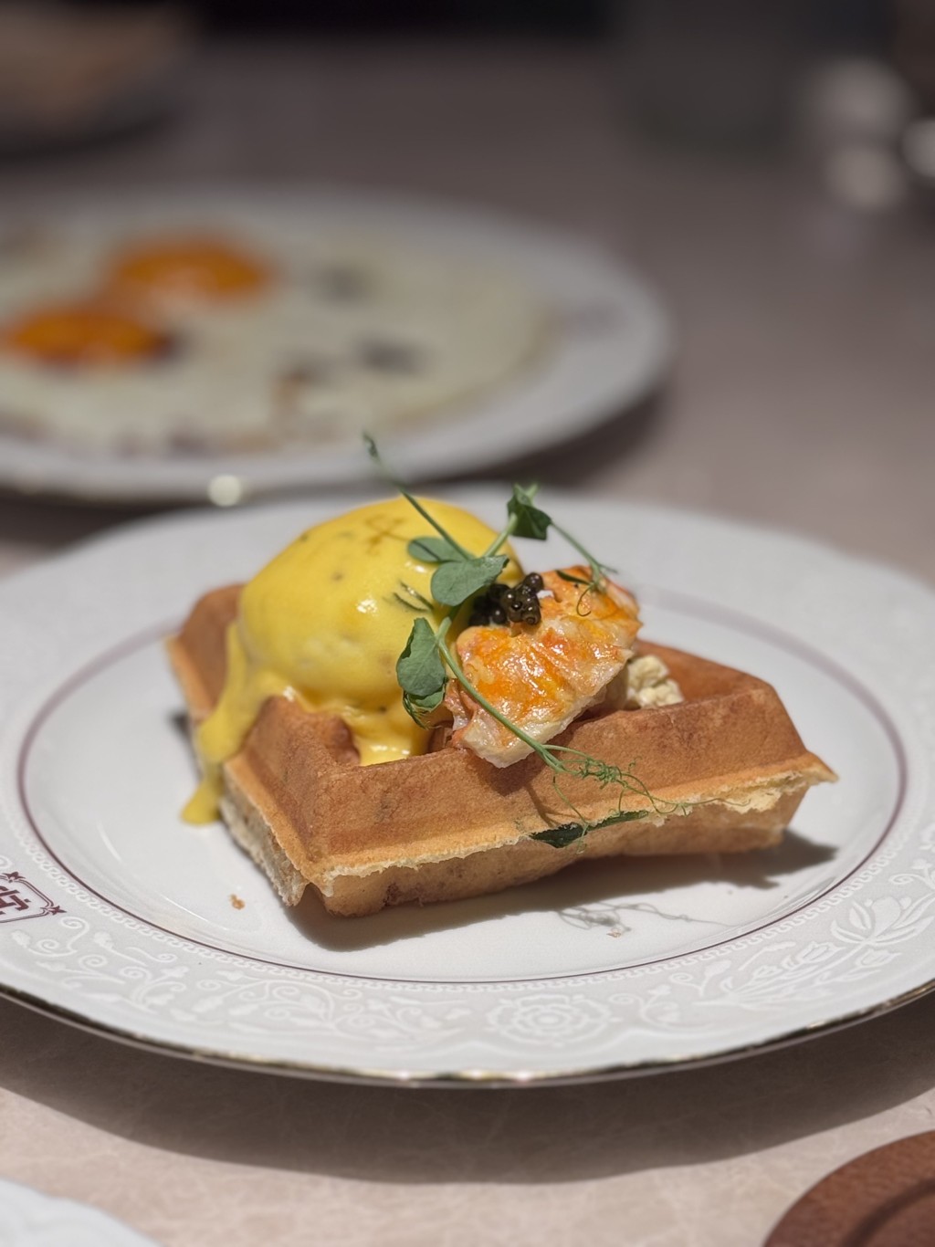 ▲早餐同樣有即點即煮菜式,這份魚子醬龍蝦雪蟹窩夫賣相非常精致。