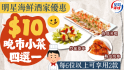 晚市小菜優惠$38一份,按人頭計算。每2-5位可享用1份椒鹽生海蝦、半只當紅炸子雞、6只金蒜銀絲蒸生蠔或海王白玉燉冬瓜盅1盅。6位以上則可享2份椒鹽生海蝦、全只當紅炸子雞、12只金蒜銀絲蒸生蠔或海王白玉燉冬瓜盅2盅。這次推出的“$38四選一”優惠不僅價格親民,還免茶位費、免芥末費及免加一服務費,性價比超高。