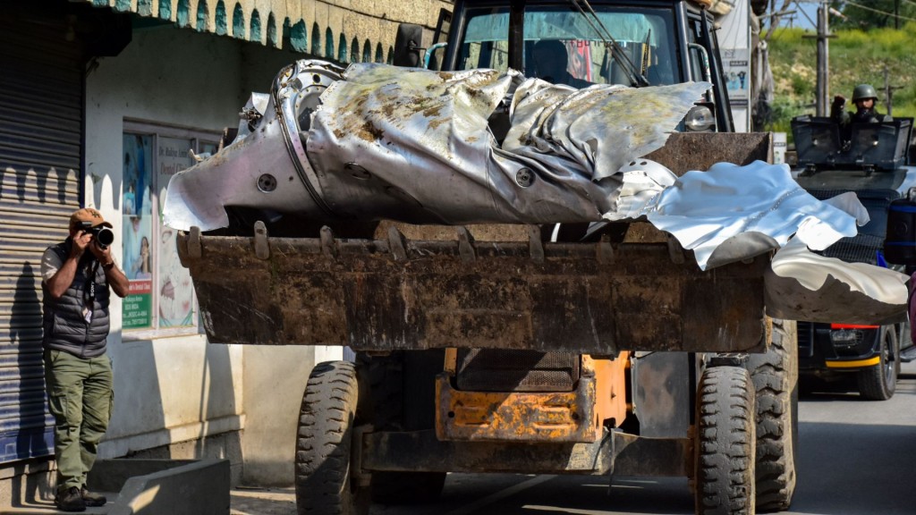 ▲印度軍機墜毀在距離斯利那加約15公里的帕姆普爾烏延地區。推土機正在運送不明軍機殘骸。 路透社